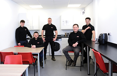 | The new canteen area at PTS Group and staff, including Directors Mark Bates (sitting left), Steve Baldwin (sitting right) and Ed Roe (standing centre) |