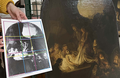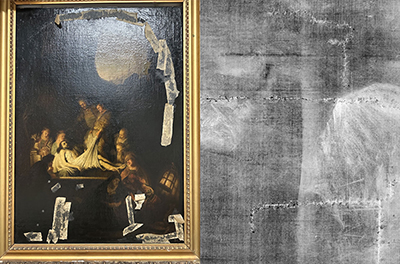| Rembrandt, The Entombment of Christ (copy); visible canvas structure with large tear, which was invisible under repairs Image courtesy of Laura Princzes, SKD |