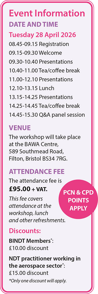 | For further information, contact: Events and Awards Department, The British Institute of Non-Destructive Testing, Midsummer House, Riverside Way, Bedford Road, Northampton NN1 5NX, UK. Tel: +44 (0)1604 438300; Email: conf@bindt.org | ![]() Registration is now open. | |