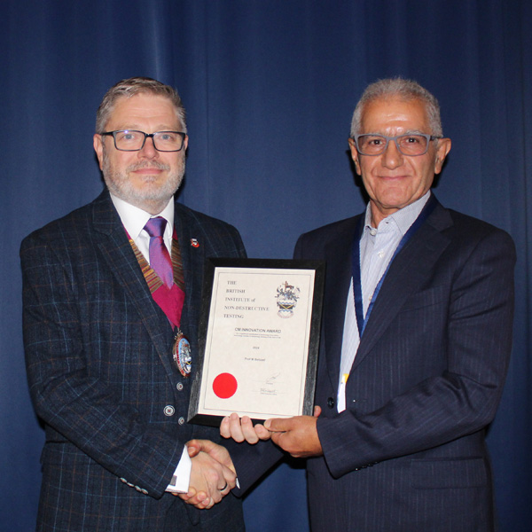 BINDT President Jason Taylor presents Professor Mehdi Behzad (right) with the CM Innovation Award