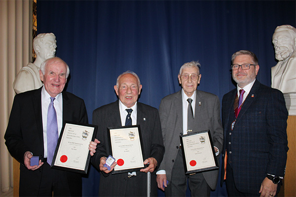 Receiving their 60-year pins were Ken Parkin (left), Eric Martin (second left) and Phillip Johnson (second right)